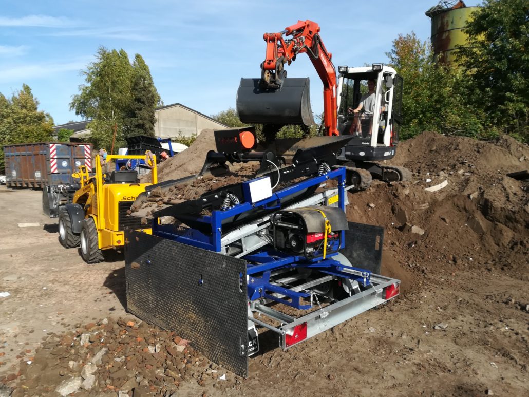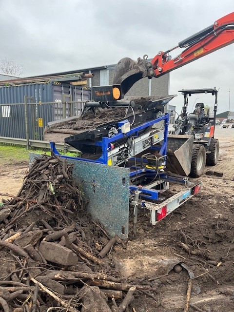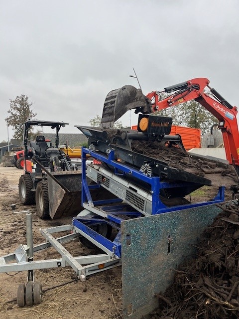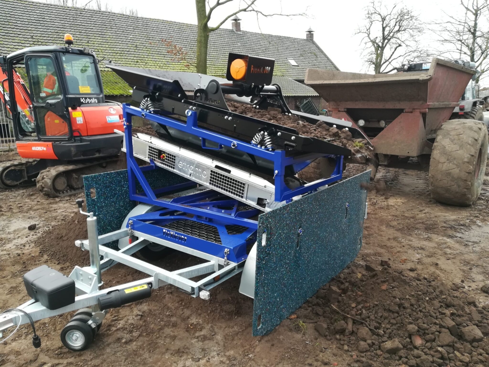 In “rijmodus” staat de machine in de lengterichting van de aanhangwagen. Wanneer er gezeefd gaat worden draait de Mini Screener 90°. Hierdoor valt de grove en fijne fractie (afvoer via transportband lengte 2m) links en rechts van de aanhangwagen en wordt er zo altijd een vrije doorgang gecreëerd. Voor de banden worden er rijplaten geplaatst zodat het materiaal makkelijk kan verwijderd worden.